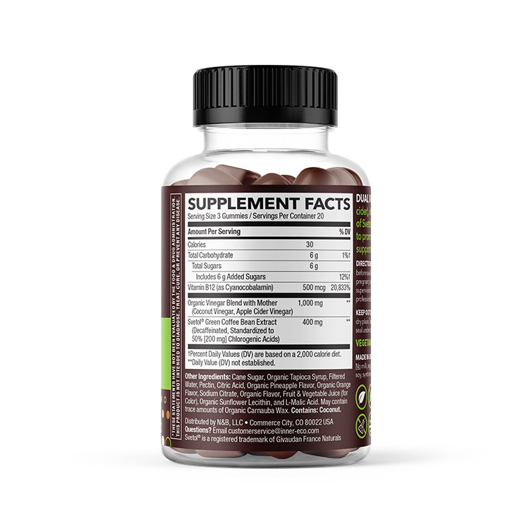 Inner-eco gummies harness the nourishing synergy of coconut and apple cider vinegar with “the mother” to support a healthy microbiome. Support your weight management journey naturally with the targeted benefits of Green Coffee Bean extract included in this formula. Our line includes targeted formulas: ginger and turmeric for muscle and joint health, green coffee bean for weight management, and ginger for digestive wellness. Inner-eco empowers vibrant, balanced health naturally.